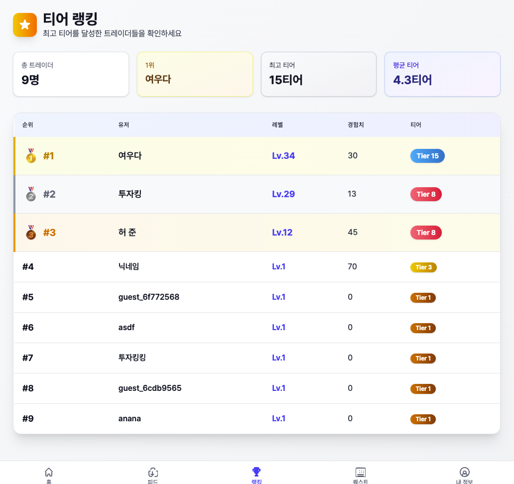 그리고 티어, 레벨을 표시해주면서 자신의 자산과 활동량을 사람들한테 보여줄 수 있도록 했다.